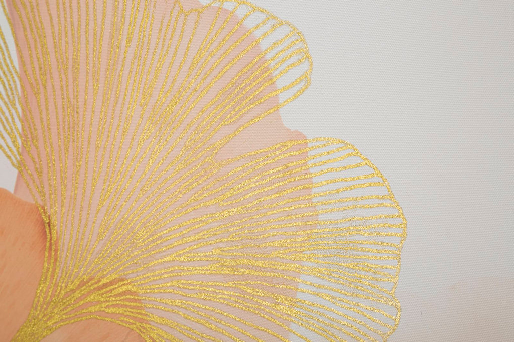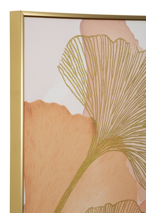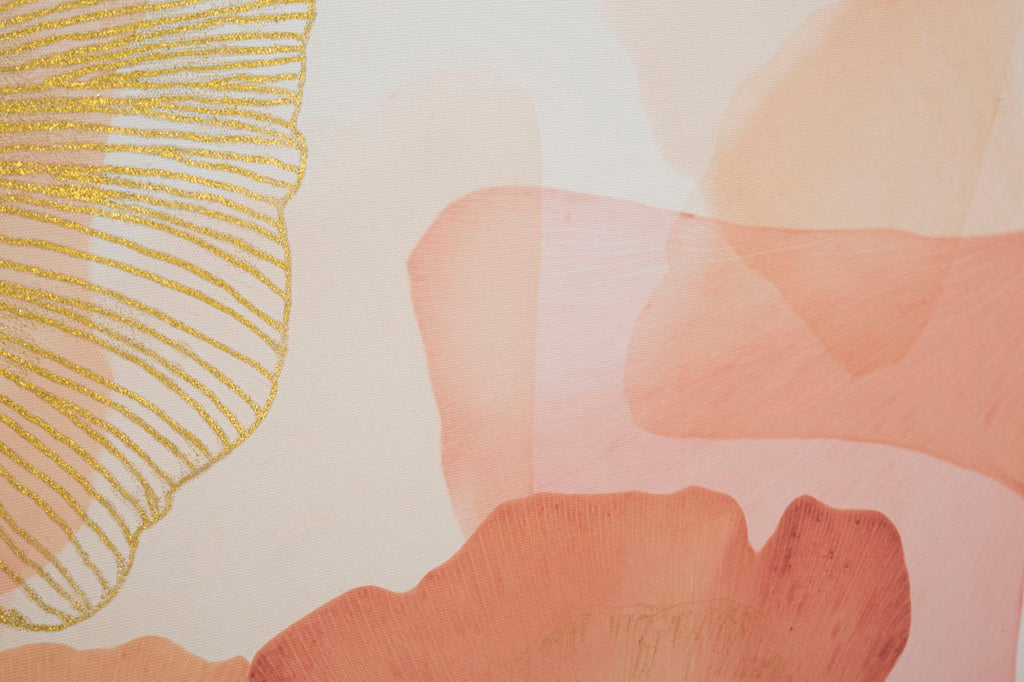 Gespannter Leinwanddruck und eleganter goldener Rahmen. Die floralen Dekorationen zusammen mit den warmen Pastelltönen verleihen einen natürlichen Hauch von Entspannung.
