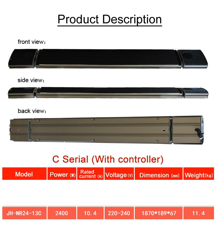 Infrarot-Heizstrahler mit Fernbedienung und integrierten 3D-Stereo-Bluetooth-Lautsprechern für IOS und Android, 2400 Watt Leistung, IPX4-Schutzklasse und Überhitzungsschutzsystem. Von der Heizung abgedeckte Fläche 30 m2 mit der Möglichkeit der Wand- oder Wandinstallation. Ideal für drinnen und draußen, Bars, Hotels, Gewächshäuser, Fitnessstudios, Hotels, Kirchen, Büros und bei allen Outdoor-Aktivitäten, die eine gezielte, sparsame und sofortige Erwärmung erfordern. Inklusive Fernbedienung mit Timer-LED-Panel.