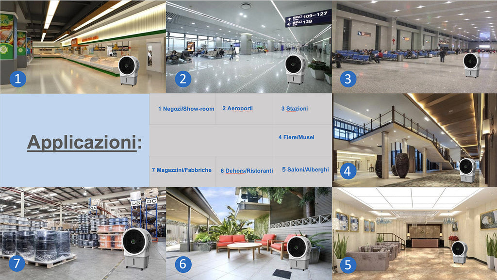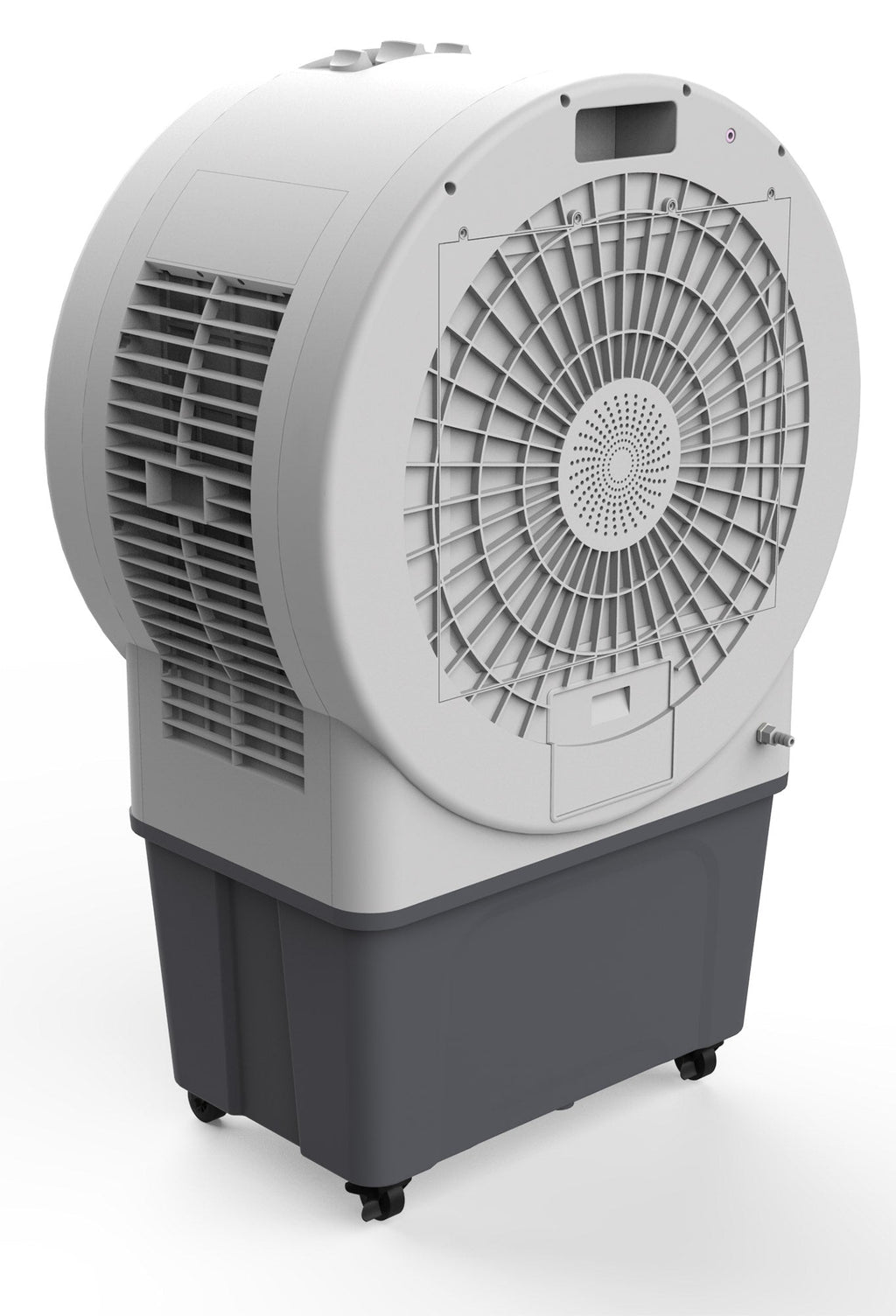 Geringer Verbrauch (250 W) ohne Verwendung von Kompressor und Gas: Es funktioniert nur mit Wasser oder Eis (für intensivere Kälte). Luftstrom von 6000 m3/h und Tank von 80 lt. 3 Leistungsstufen. Leicht und mit Rädern ausgestattet, kann er auch als einfacher Ventilator verwendet werden.