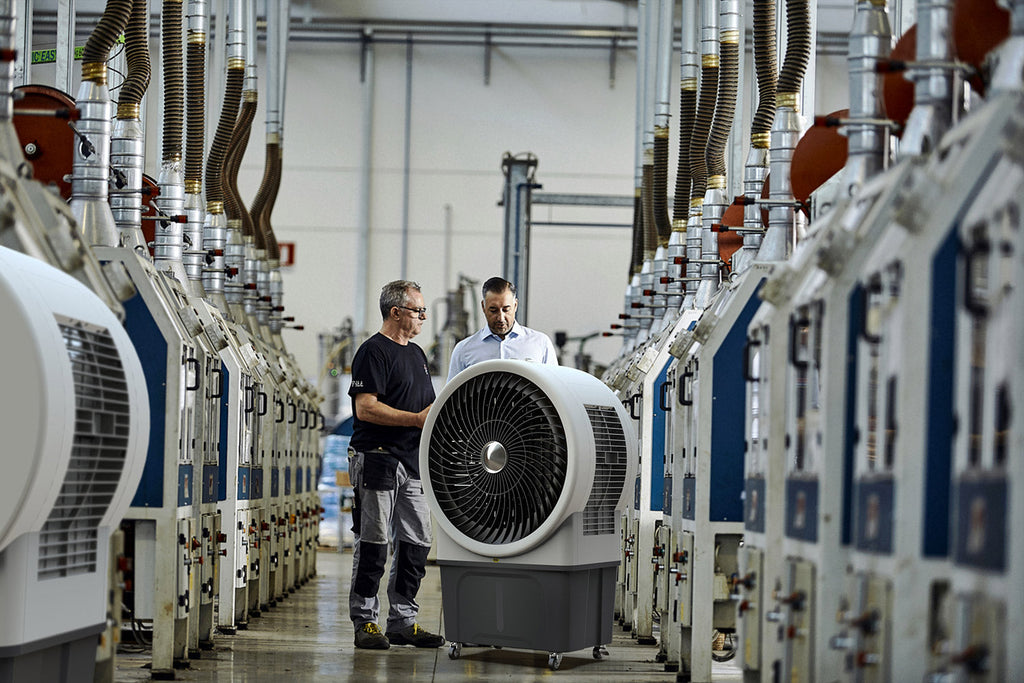 Sehr leistungsstarker Verdunstungskühler für große Räume. Heiße Luft strömt durch die Wabenstruktur, verdampft das Wasser und kühlt es auf natürliche Weise ab.