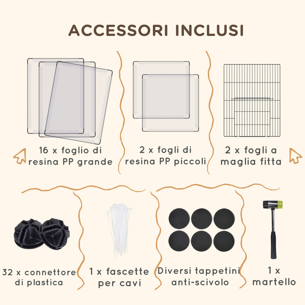 - FORMA MODULABILE Il nostro recinto per animali si compone di 20 pannelli e 32 laccetti per creare strutture modulabili con gli spazi a disposizione, permettendoti di realizzare forme diverse. È possibile integrare altri set per una struttura più grande