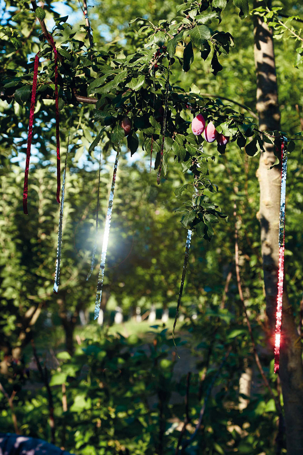 Es wird in der Nähe von Feldfrüchten wie Gemüse und Obst verwendet. Das Glitzern des Bandes auf beiden Seiten, sogar vom Wind bewegt, schafft es, die Spatzen zu erschrecken.