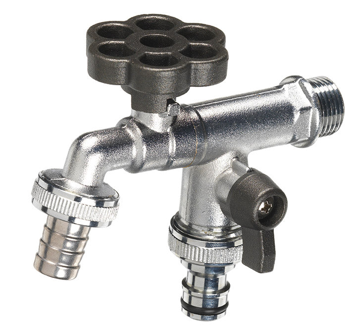 Rubinetto a sfera cromato a doppia uscita, principale con attacco gomma tradizionale, secondaria con attacco gomma rapido.