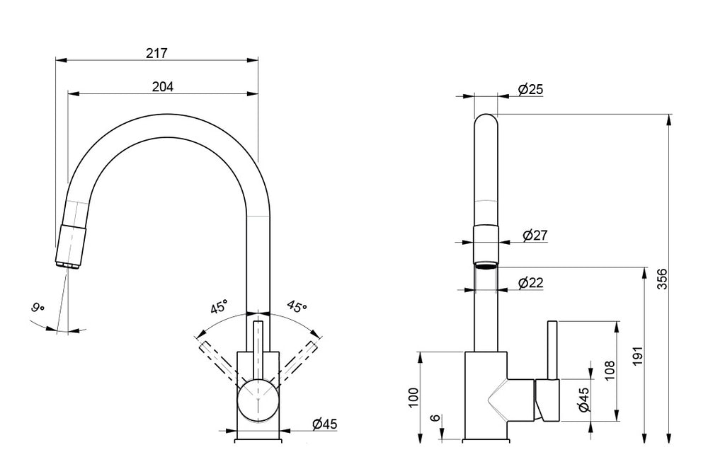 Kitchen River Spültischmischer mit rundem schwarzem Schwenkauslauf aus Edelstahl.