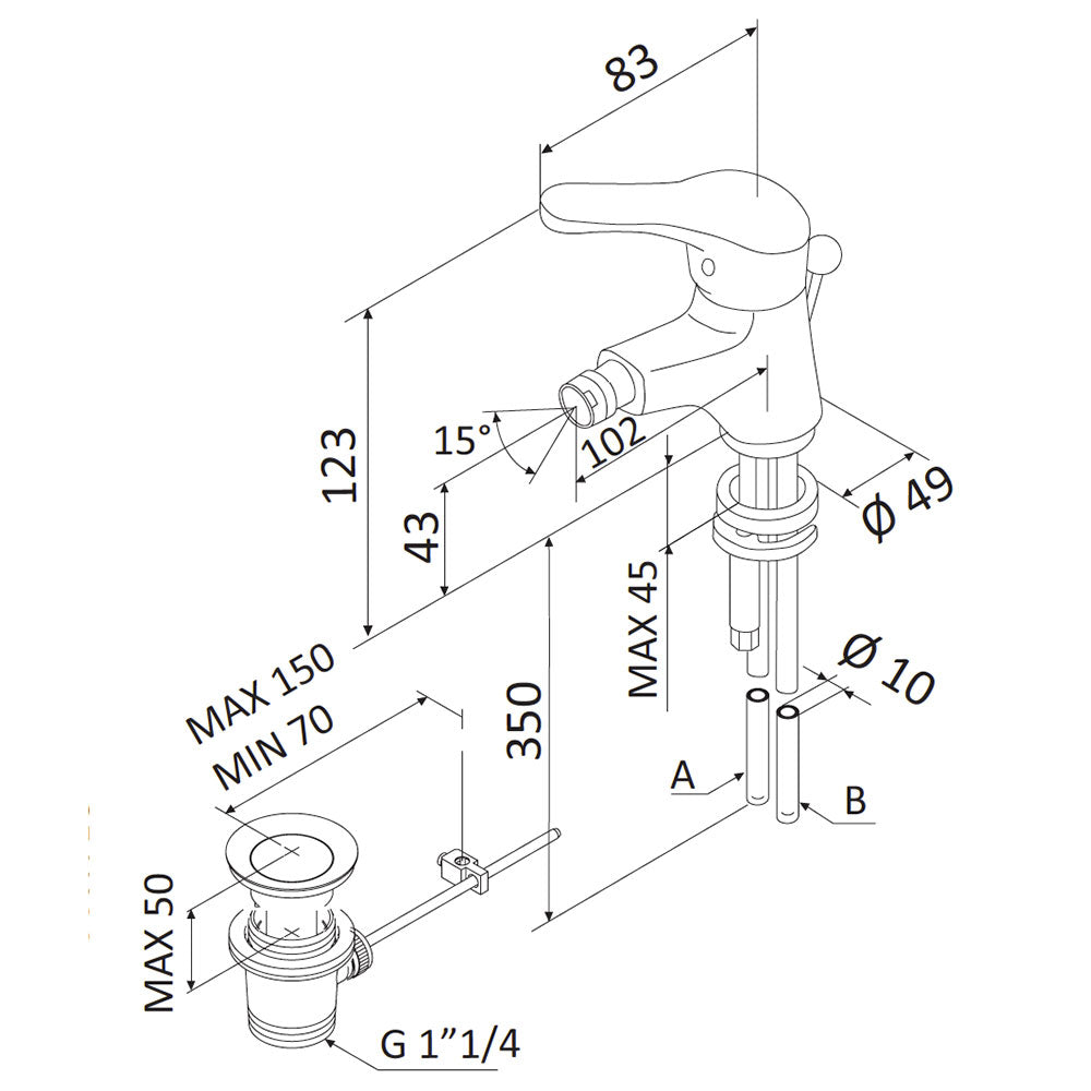 Mariani Epic 493/E2 Einhebel-Bidetmischer mit Ablaufgarnitur . Kartuscheneinstellung Keramikscheibe ø 40 mm.