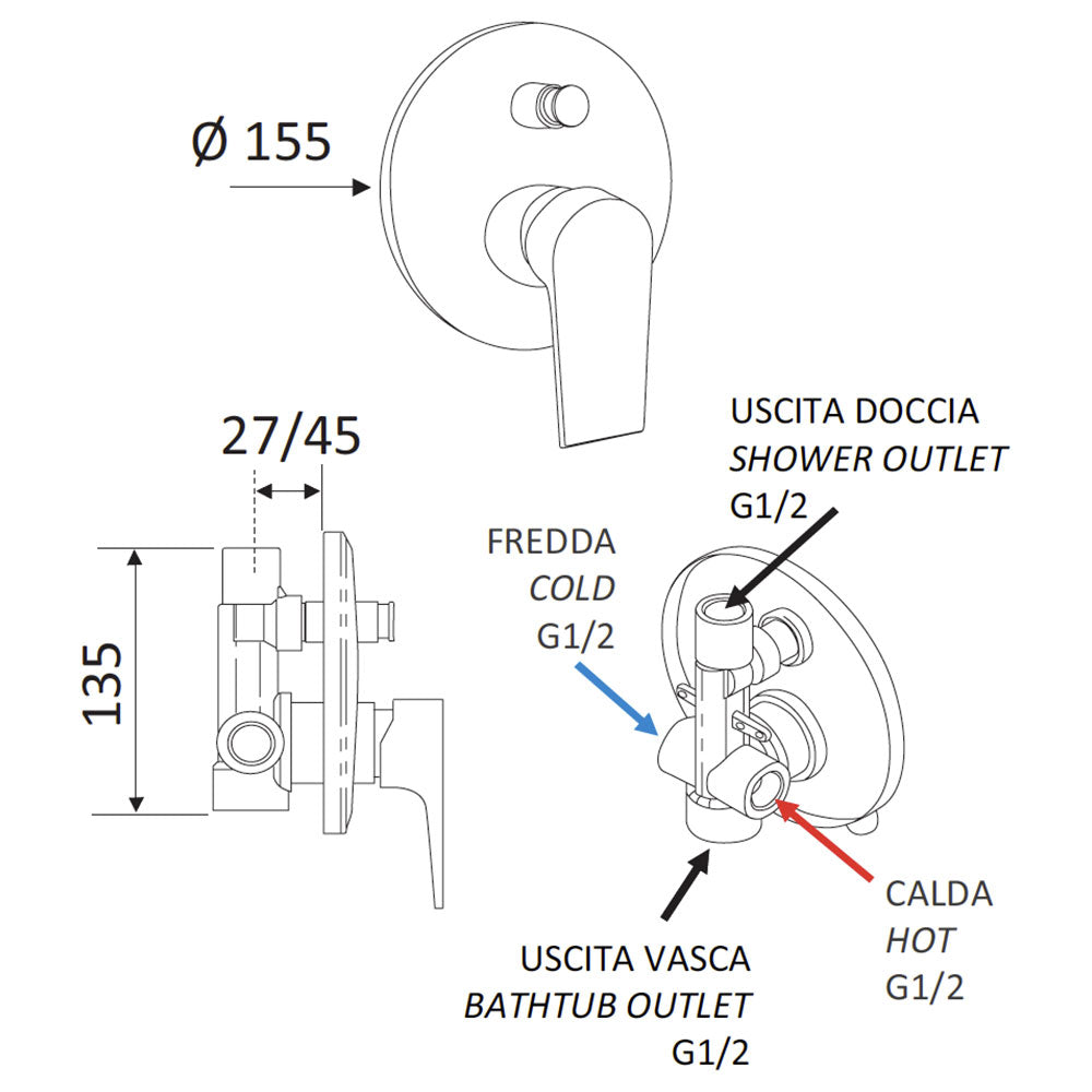 Einbau-Einhebel-Duschmischbatterie mit verchromtem Mariani Artic Messing-Umsteller