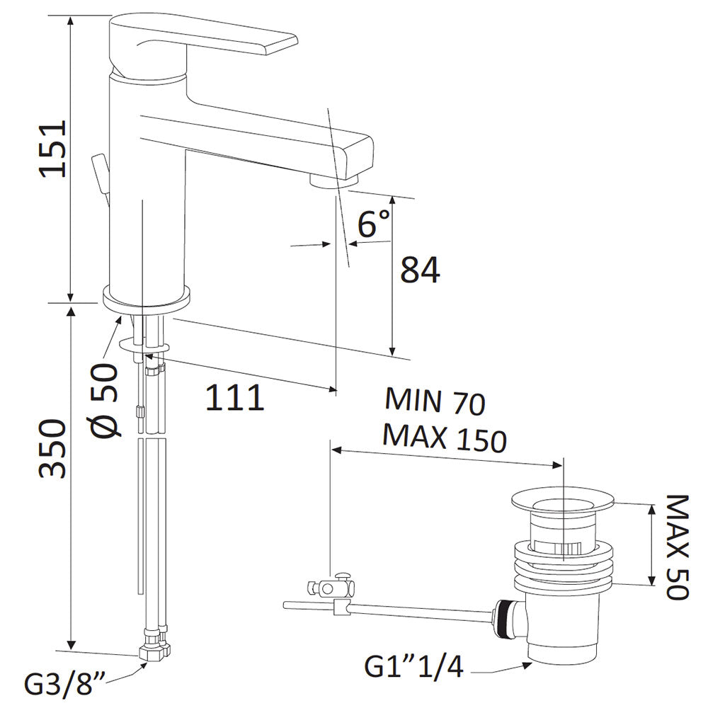 Mariani Artic 393/AT Einhebel-Waschtischmischer mit Ablaufgarnitur . Kartuscheneinstellung Keramikscheibe ø 35 mm.