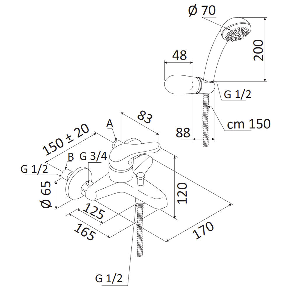 Externer Wannenmischer Mariani Epic 230/E2 . Mit Handbrause und Zubehör, Kartusche mit Keramikscheibe ø 40 mm.