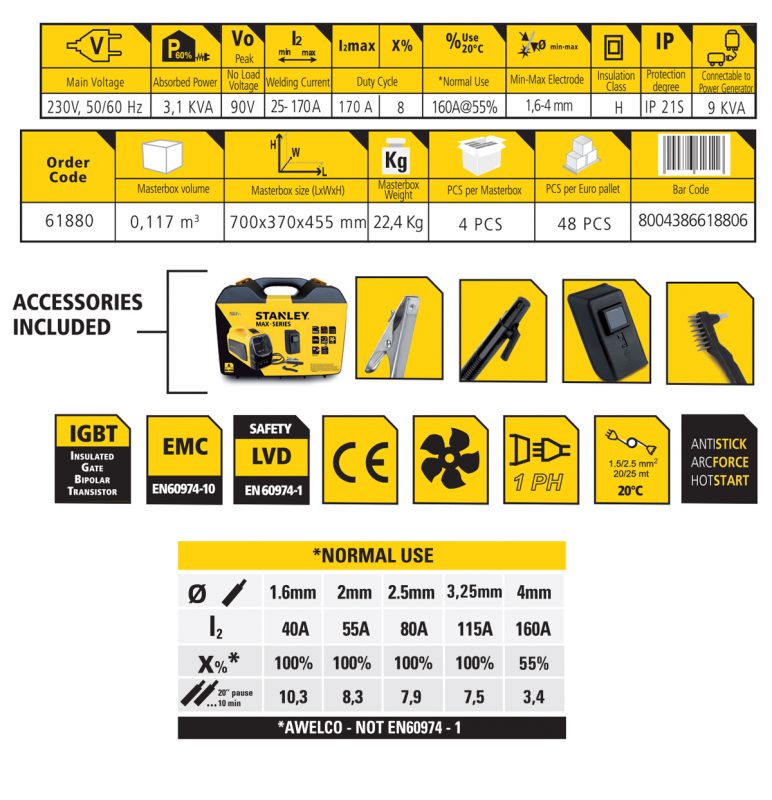Das zum Elektrodenschweißen geeignete Schweißgerät Stanley Max 180, allgemein als MMA bezeichnet, verwendet einen Inverter- Stromgenerator, der einen Niederspannungsstrom und viele Ampere reproduziert, die zur Bildung eines Lichtbogens verwendet werden, der durch seine Wärme das Metall schmilzt Schweißgut und das Zusatzmaterial bestehend aus einer umhüllten Elektrode . Um eine perfekte Schweißnaht auszuführen, muss die richtige Stromstärke eingestellt werden, die je nach Durchmesser der Elektrode und der zu schweißenden Dicke variiert. Leicht , kompakt und zuverlässig . Geeignet für rutile, basische, Edelstahl-, Gusseisenelektroden. Mit Aktentasche .