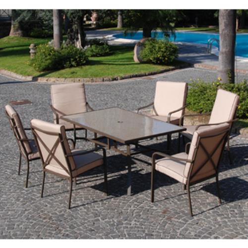 Sitzecke bestehend aus Tisch mit dekorierter Glasplatte in Marmorfarbe, 6 stapelbaren Sesseln mit Kissen aus beigefarbenem Polyester, röhrenförmig mit witterungs- und rostbeständigem Epoxidpulver lackiert.