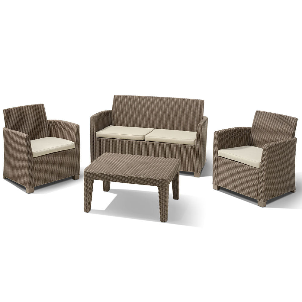Wohnzimmer aus stoßfestem Harz, bestehend aus einem 2-Sitzer-Sofa, zwei Sesseln, Couchtisch und Kissen.