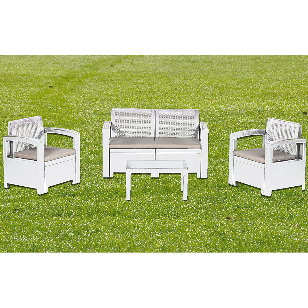 Wohnzimmer aus stoßfestem Harz, bestehend aus einem 2-Sitzer-Sofa, zwei Sesseln, Couchtisch und Kissen.
