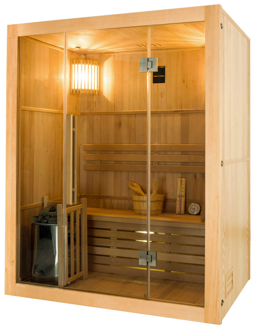 Die Sense Sauna vereint alle Zutaten, die dazu beitragen, loszulassen, den Geist zu befreien und den Körper zu entspannen.Diese traditionelle kanadische Fichtenholzsauna ist eine echte Einladung, bequem mit dem Rücken oder im Liegen zu sitzen und einen Moment vollkommener Gelassenheit zu genießen. Die klassischen Lichter in den oberen Ecken der Kabine und unter der Bank schaffen eine entspannende Atmosphäre, während die große Glasfläche ein Gefühl der Offenheit nach außen weckt.Die mit dem Sense gelieferte elektrische Heizung sorgt für eine einhüllende Wärme, die der Entspannung und Freisetzung förderlich ist Fügen Sie mit dem im Saunaset enthaltenen Holzlöffel Wasser zu den Lavasteinen des Ofens hinzu und genießen Sie Ihre Wellness-Sitzung in vollen Zügen, um sich nach Belieben zu erneuern.