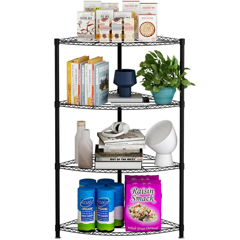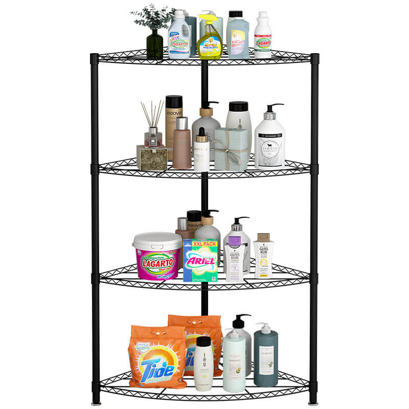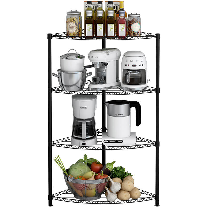 4-stöckiges Regal mit schwarzem Metalldrahtrahmen und Einlegeböden. Ideal für die Küche oder das Badezimmer, kann es in allen Räumen des Hauses verwendet werden, um die Einrichtung von Ecken mit Stil und Zweckmäßigkeit zu lösen.