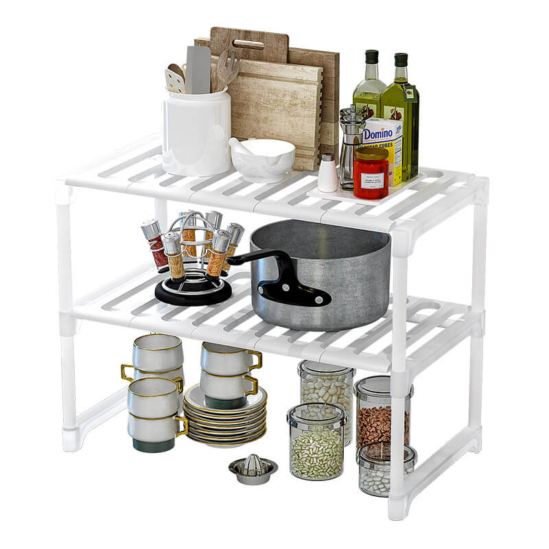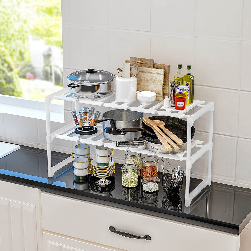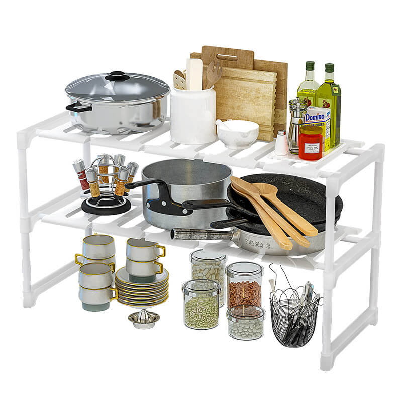 Ausziehbares Regal mit Metallrahmen und Kunststoffregalen, die Breite kann von 52 cm geschlossen bis maximal 86 cm reichen. Ideal für die Küche, kann es in allen Räumen des Hauses verwendet werden, auf einer Oberfläche ruhend oder in Schränken und Möbeln.