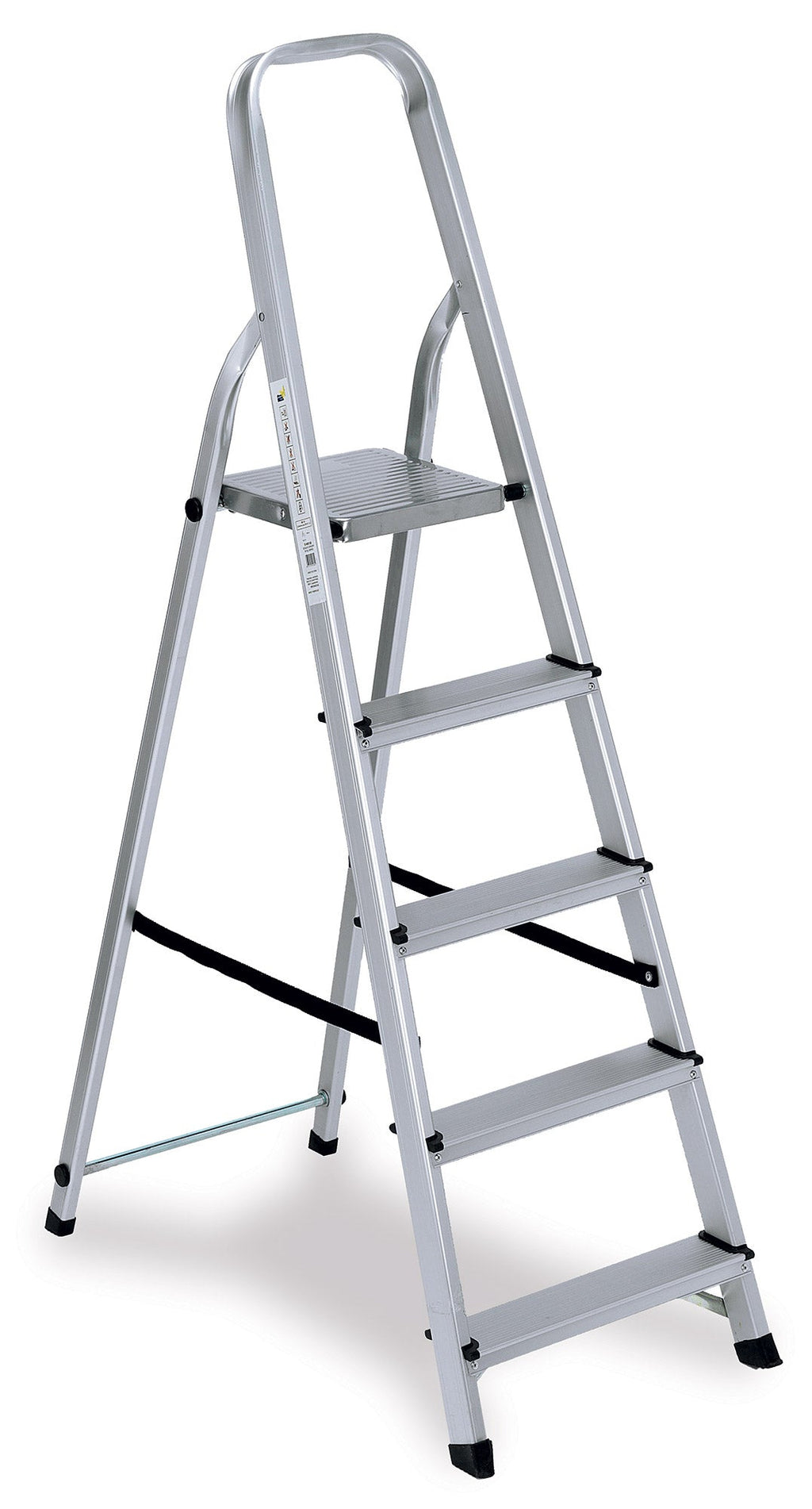 Aluminiumleiter mit fünf rutschfesten Stufen, rutschfesten Spitzen, Spreizband und Sicherheitshaken. Empfohlen für den Heim- und Heimwerkergebrauch. Maximale Kapazität 150 kg.