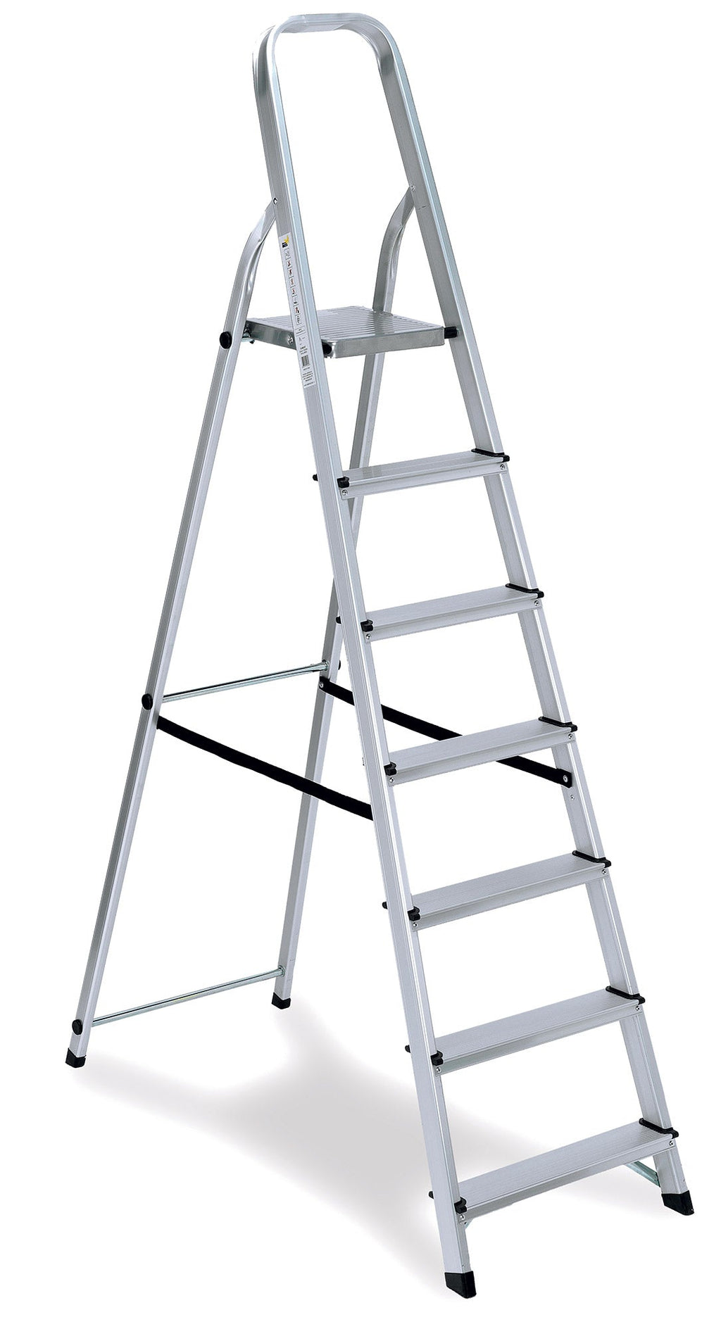 Aluminiumleiter mit sieben rutschfesten Stufen, rutschfesten Spitzen, Spreizband und Sicherheitshaken. Empfohlen für den Heim- und Heimwerkergebrauch. Maximale Kapazität 150 kg.
