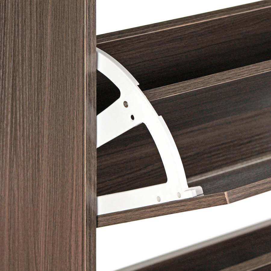 Scarpiera salvaspazio 4 ribalte Tutte le tue calzature troveranno spazio in questa bellissima scarpiera salvaspazio dal design moderno. La nuova scarpiera Marta ha struttura in legno melaminico color noce, 4 ribalte con doppio ripiano e maniglie stilizzate in alluminio.