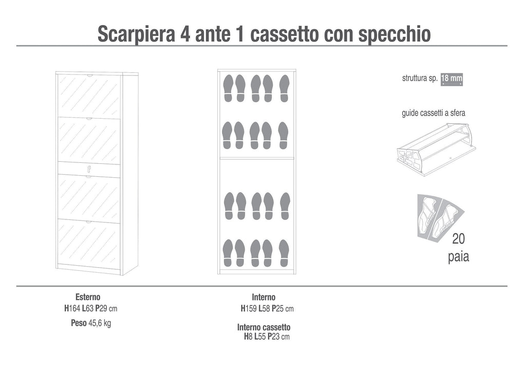 Schuhschrank 4 Türen mit Spiegel 1 Schublade 63x164x29 cm Zement