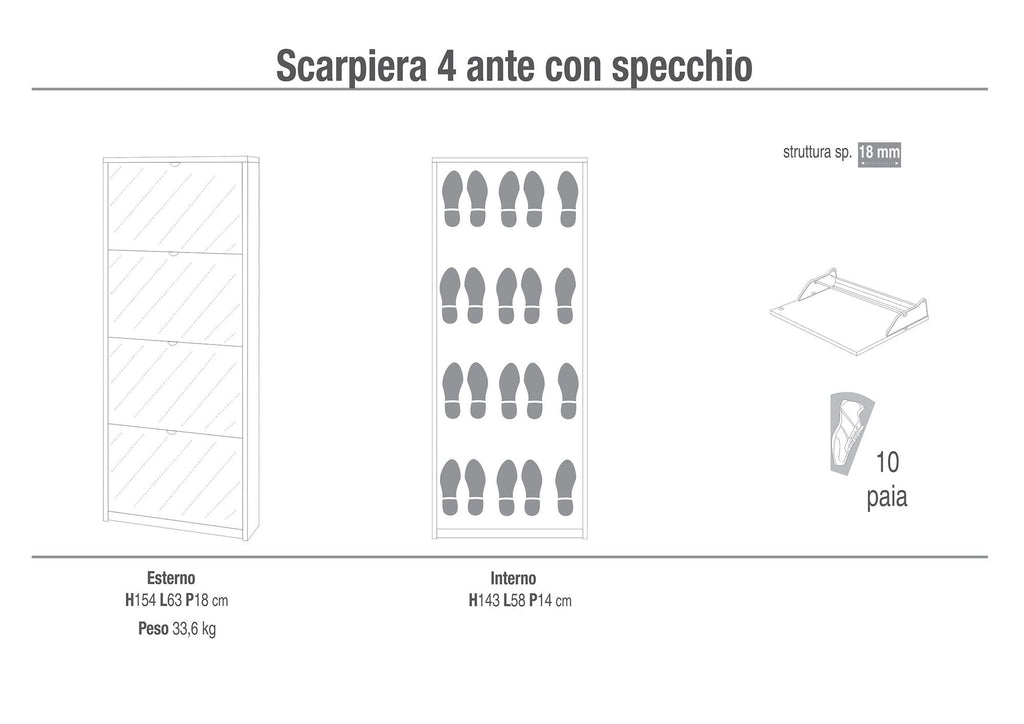 Schuhschrank 4 Türen mit Spiegel 63x154x18 cm Oxidweiß