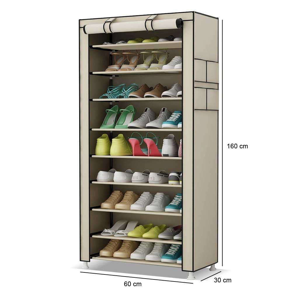 Realizzata con struttura in acciaio e tessuto in TNT impermeabile di colore beige con apertura frontale arrotolabile. Grazie alla cerniera a Zip le scarpe saranno ben protette dalla polvere.
