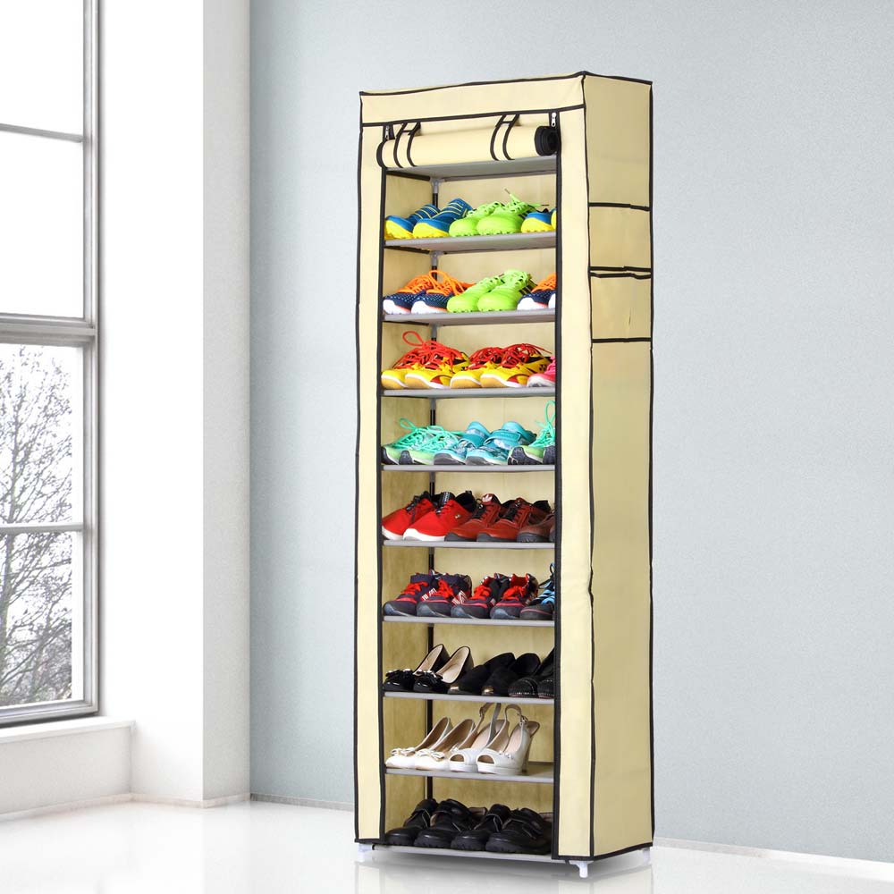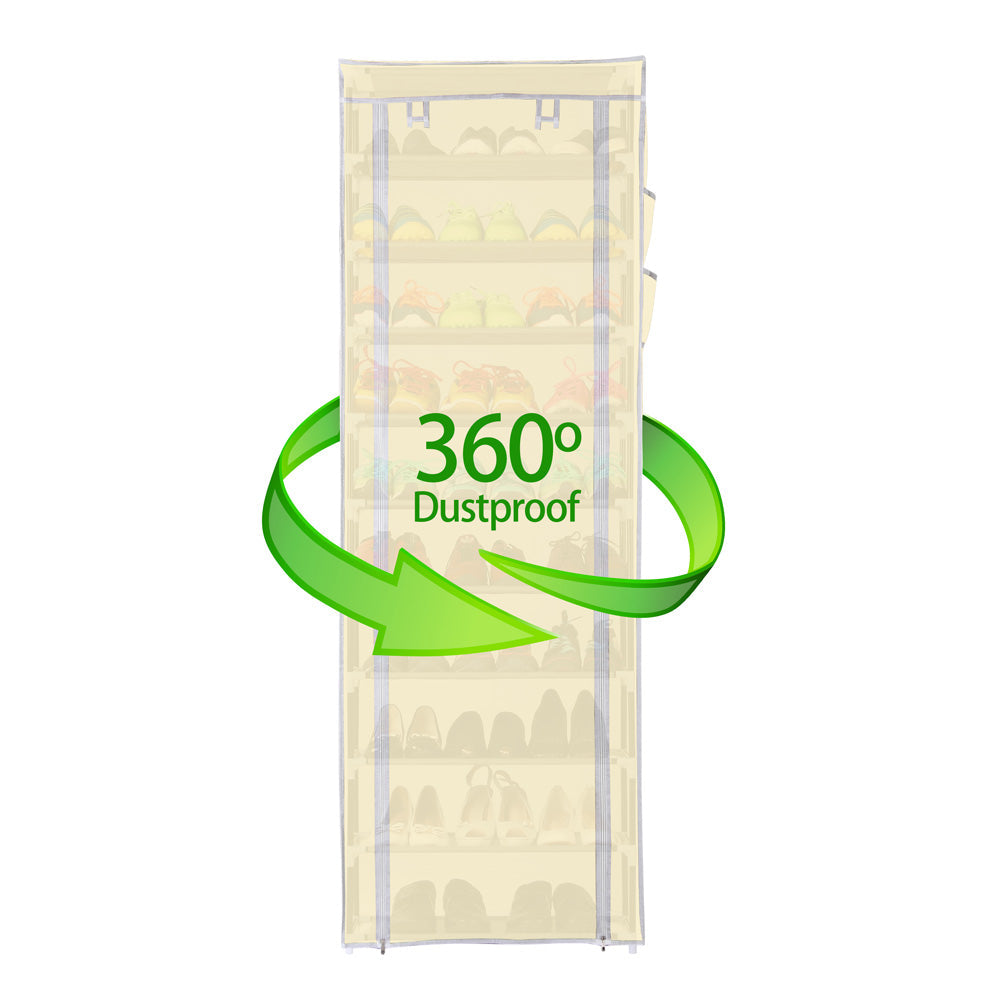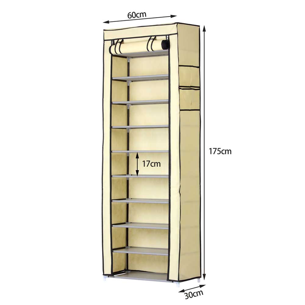 Realizzata con struttura in acciaio e tessuto in TNT impermeabile di colore beige con apertura frontale arrotolabile. Grazie alla cerniera a Zip le scarpe saranno ben protette dalla polvere.