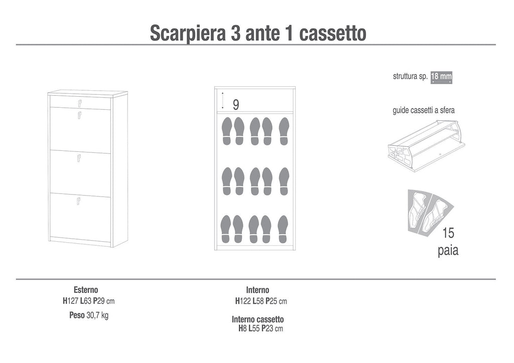 Scarpiera Salvaspazio 3 Ante 1 Cassetto 15 Paia 63x127x29 cm Noce Stelvio