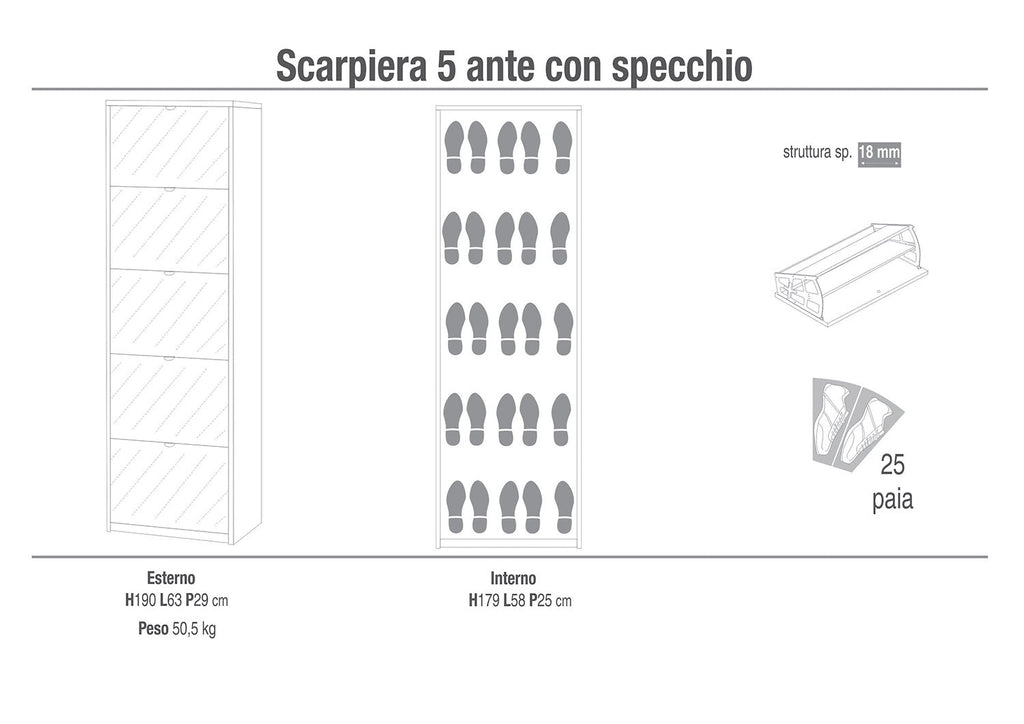 Scarpiera Salvaspazio 5 Ante con Specchio 25 Paia 63x190x29 cm Noce Stelvio