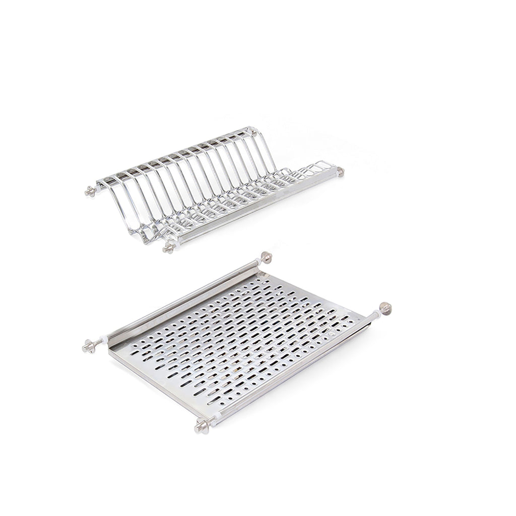Abtropfgestell mit zwei Ebenen und Tropfschale, komplett aus Edelstahl (Gitterroste und Gläser aus Edelstahl AISI 430 und Tropfschale aus Edelstahl AISI 304). Verbessern und optimieren Sie die Ordnung von Geschirr und Gläsern in Küchenmöbeln. Die Installation ist sehr einfach und die Befestigung am Möbelstück sehr widerstandsfähig: Montage mittels 8 seitlicher Stifte, die das Tablett an das Möbelstück anpassen.