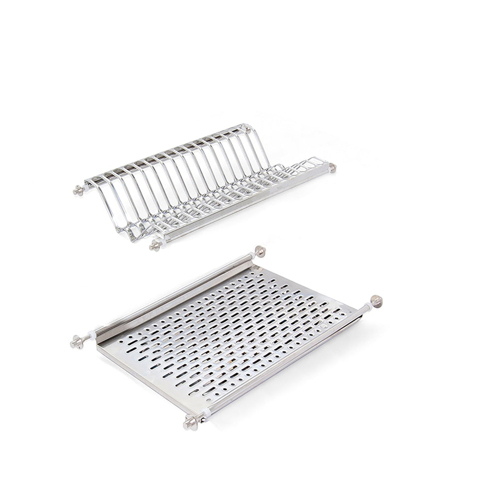 Abtropfgestell mit zwei Ebenen und Tropfschale, komplett aus Edelstahl (Gitterroste und Gläser aus Edelstahl AISI 430 und Tropfschale aus Edelstahl AISI 304). Verbessern und optimieren Sie die Ordnung von Geschirr und Gläsern in Küchenmöbeln. Die Installation ist sehr einfach und die Befestigung am Möbelstück sehr widerstandsfähig: Montage mittels 8 seitlicher Stifte, die das Tablett an das Möbelstück anpassen.