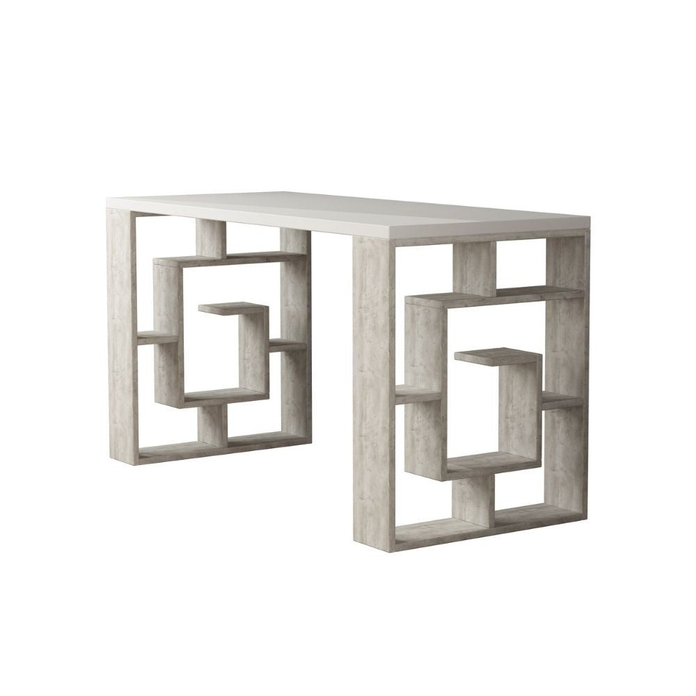 - La scrivania è bianca con piedi a forma di labirinto e in materiale truciolare di alta qualità