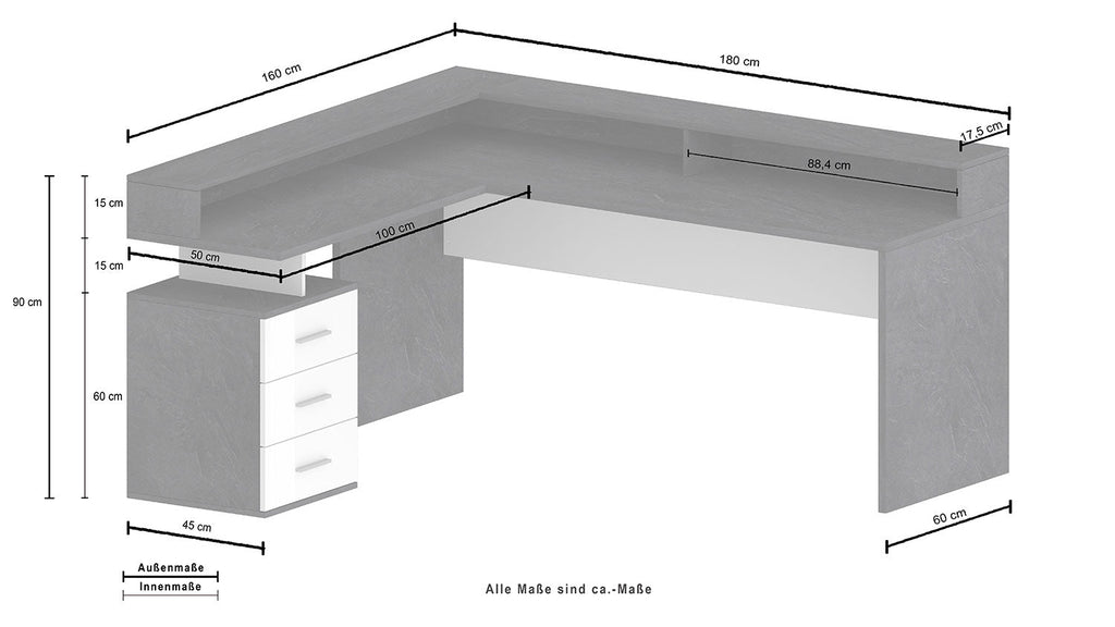Scrivania Angolare 3 Cassetti e Ripiani a Giorno 180/160x60x90 cm New Selina Bianco Lucido