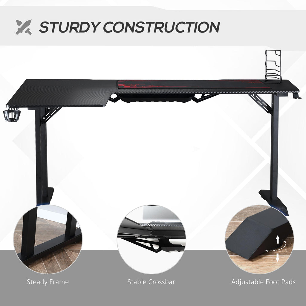 Um optimal arbeiten und spielen zu können, brauchen Sie den richtigen Arbeitsplatz und der Eckschreibtisch ist genau das Richtige für Sie! Es hat ein attraktives Design mit einer Oberfläche in Kohlefaser-Optik und ist mit praktischem Zubehör wie Kopfhörerhaken, Getränkehalter und Gamepad-Halter ausgestattet. Dank der Metallstruktur ist dieser moderne Schreibtisch für eine lange Lebensdauer bestimmt, um Sie bei jedem Abenteuer Ihrer Gaming-Sessions zu begleiten.