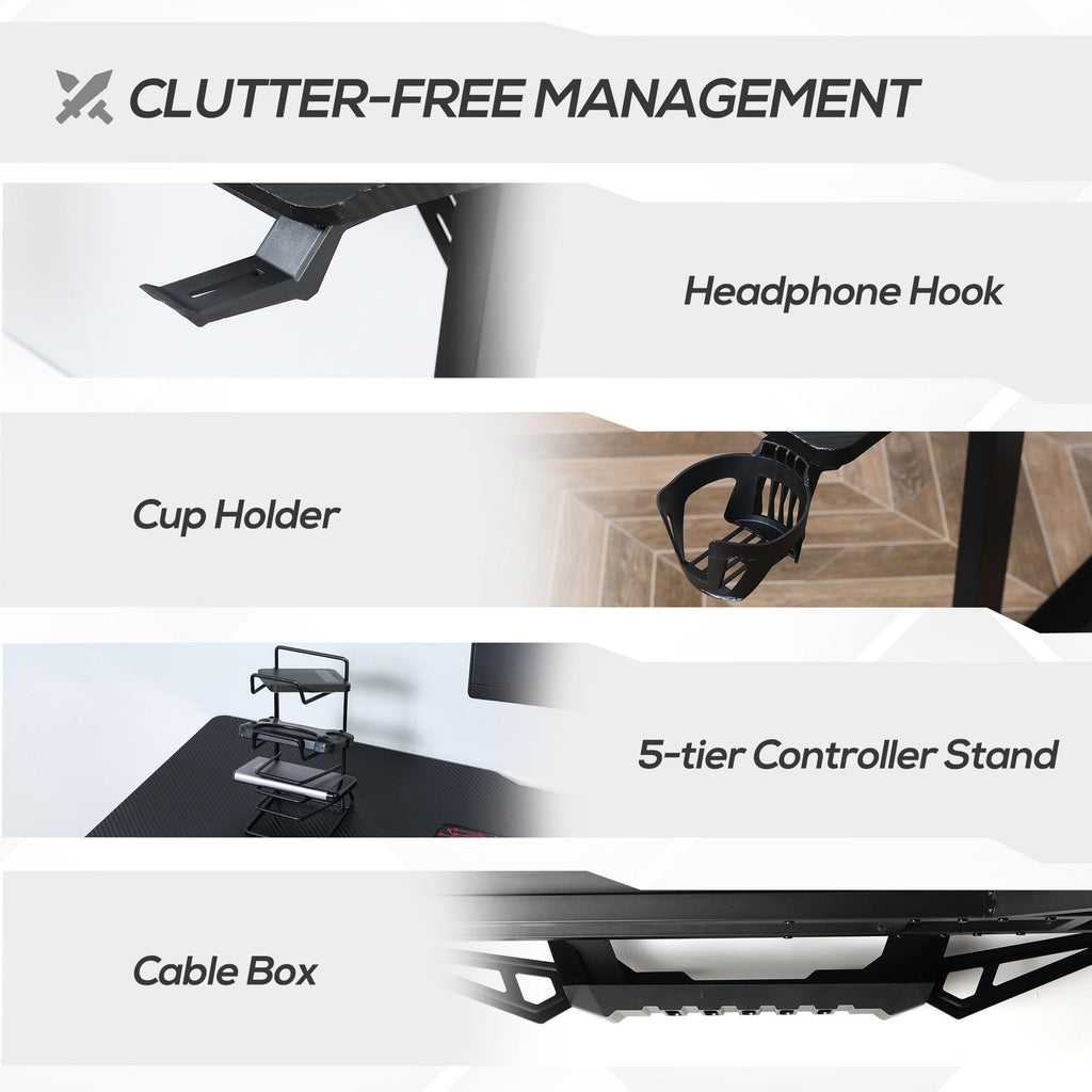 - FUNKTIONELLES DESIGN: Der Gaming-Schreibtisch verfügt über einen praktischen Getränkehalter, einen Kopfhörerhaken, eine 5-stufige Controller-Halterung und ein Kabelmanagementsystem unter der Arbeitsfläche.