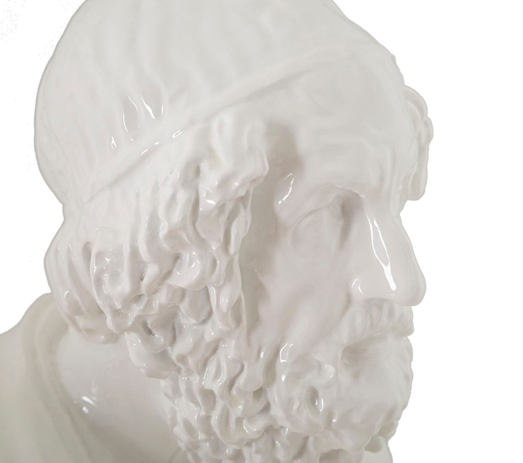 Questo busto bianco rappresenta un vecchio saggio con un'aura di saggezza che si manifesta attraverso ogni dettaglio. La delicatezza dei tratti del viso, le linee incise sui capelli e le rughe sulla fronte fanno emergere l'esperienza e la profonda conoscenza del mondo che solo gli anni possono donare. L'eleganza del busto è ulteriormente accentuata da un'espressione calma e serena, che riflette un'anima pacifica e riflessiva. Davvero un pezzo d'arte sorprendente che cattura l'attenzione di chiunque lo osservi.