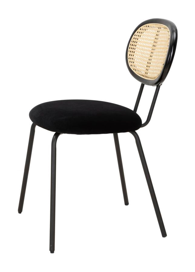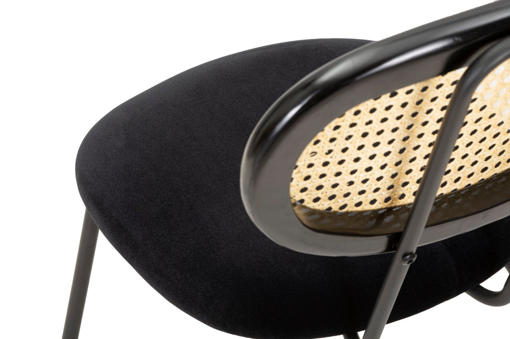Schwarzer Metallstuhl mit gepolstertem Stoffsitz und Rückenlehne mit Details aus Wiener Stroh. Das geradlinige Design und die Kombination der Materialien machen es zu einem perfekten Mix für jede Art von Möbeln.
