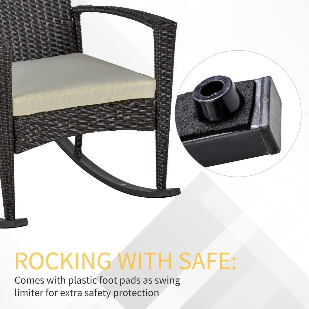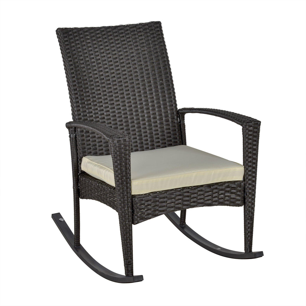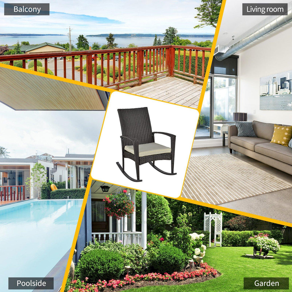 Lassen Sie sich vom Schaukelstuhl wiegen und genießen Sie Ihre Außenbereiche. Es hat einen soliden Metallrahmen, der mit PE-Rattan überzogen ist, was für Stabilität und Witterungsbeständigkeit sorgt. Dieser Rattan-Schaukelstuhl hat eine große Sitzfläche mit gepolstertem Kissen, Rückenlehne und Armlehnen, die Ihre Entspannung optimal unterstützen. Nehmen Sie es gleich mit in Ihren Garten oder auf Ihre Terrasse!