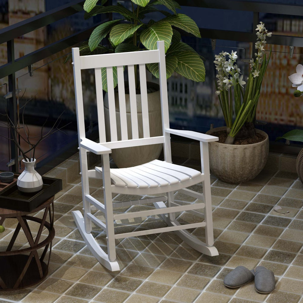 Möchten Sie einen Schaukelstuhl zum Entspannen auf der Terrasse? Dieser Stuhl ist perfekt für Sie: Er besteht aus weiß lackiertem Pappelholz, ist UV-beständig und auf Langlebigkeit ausgelegt. Sein Design ist komfortabel und ergonomisch dank der hohen Rückenlehne, der breiten Sitzfläche und den zwei bequemen Armlehnen. Lehnen Sie sich zurück, entspannen Sie sich und genießen Sie den Sonnenuntergang von Ihrem neuen Liegestuhl aus!