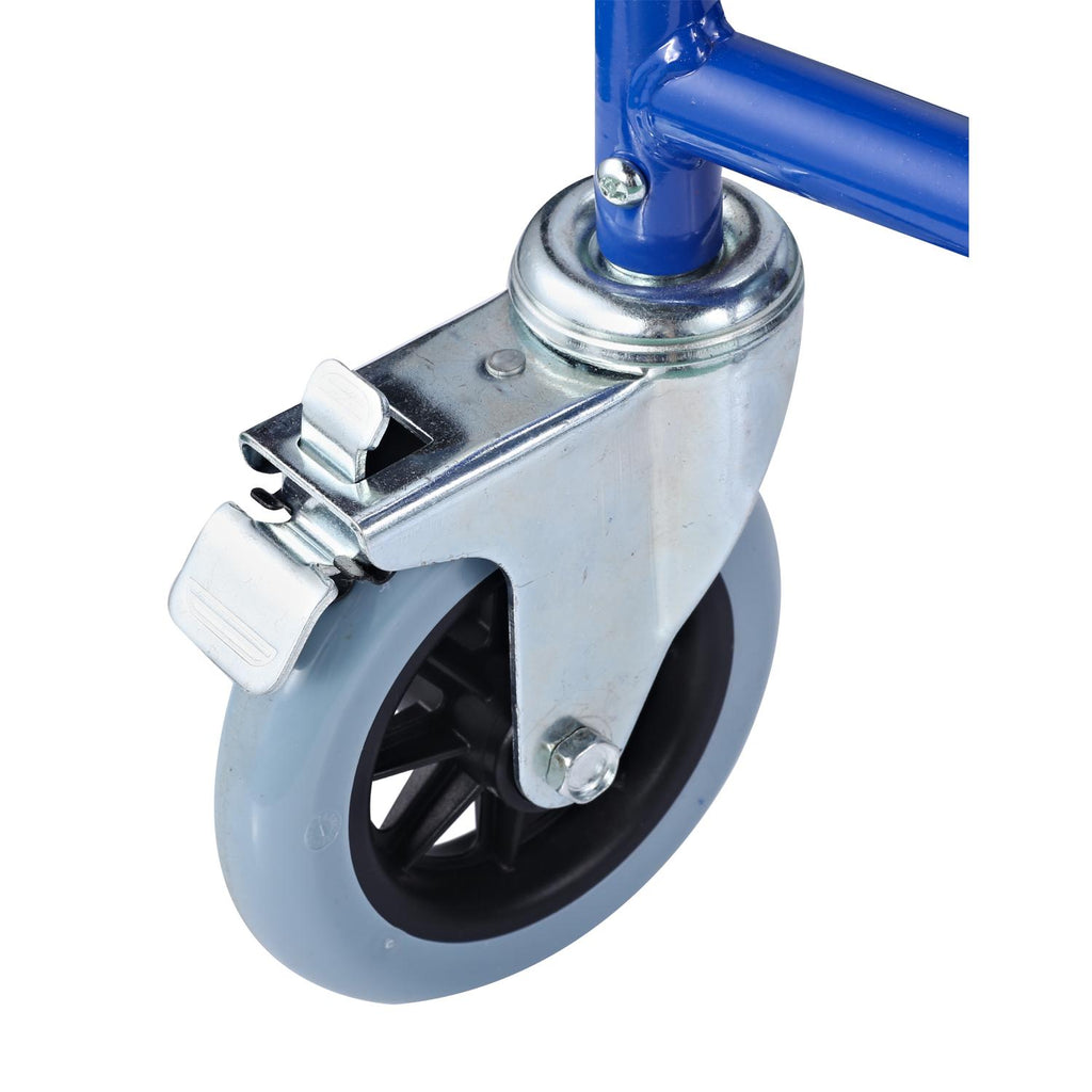 4 multidirektionale Kunststoffräder, die Hinterräder sind mit Bremsen ausgestattet.