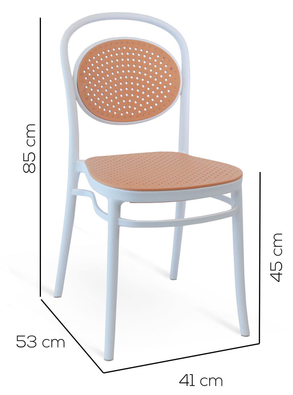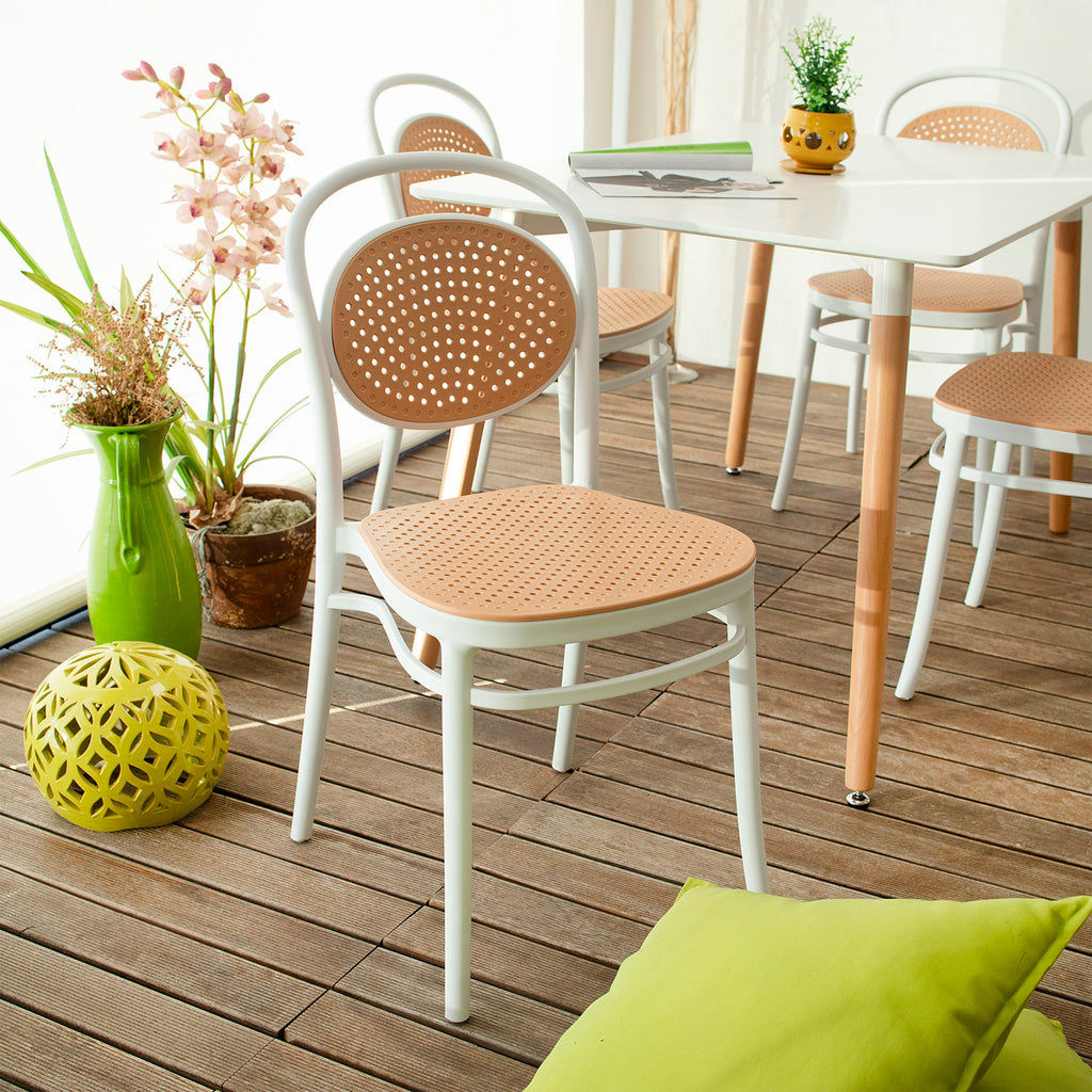 Il design della sedia Cosette ricorda quello delle eleganti e classiche sedie, ma reinventato con un materiale moderno e versatile, il polipropilene. Il contrasto di colori tra il beige dello schienale e della seduta, entrambi leggermente forellati, e il bianco della struttura dona alla sedia un carattere deciso e particolare. Ideale per uso sia all'interno che all'esterno, è perfetta per arredare una cucina o un living, oppure un patio o un locale.