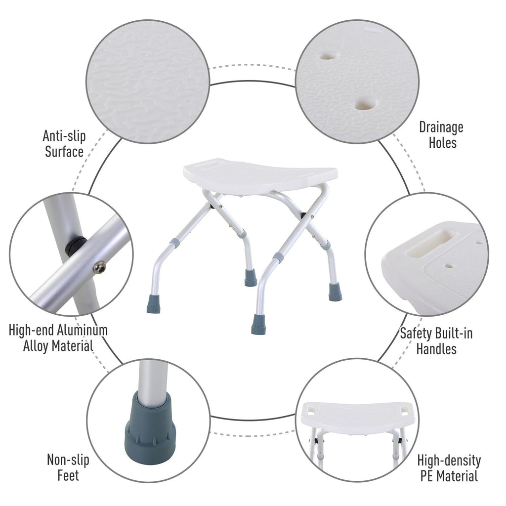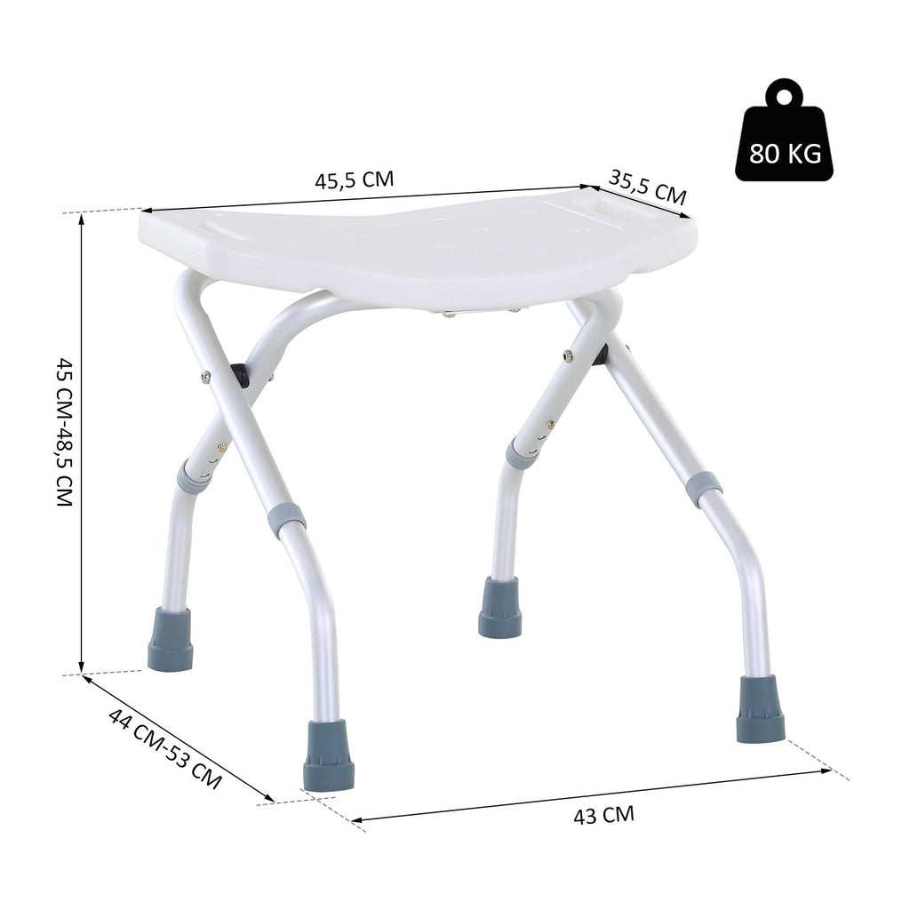 Trotz seiner kompakten Größe eignet sich dieser Duschstuhl perfekt für die Unterstützung von Erwachsenen mit einem Gewicht von bis zu 300 lbs. Insbesondere soll es älteren Menschen, Schwangeren oder Verletzten helfen. Es besteht aus Aluminium und PE, wasserdichten und leicht zu reinigenden Materialien, ideal für den Einsatz im Innen- und Außenbereich. Die Höhe des Sitzes ist verstellbar , um allen Bedürfnissen gerecht zu werden. Darüber hinaus bietet er dank der rutschfesten Füße einen stabilen und sicheren Stand und ist ein unverzichtbares Hilfsmittel, um die Unabhängigkeit und Privatsphäre beim Toilettengang wiederzuerlangen.