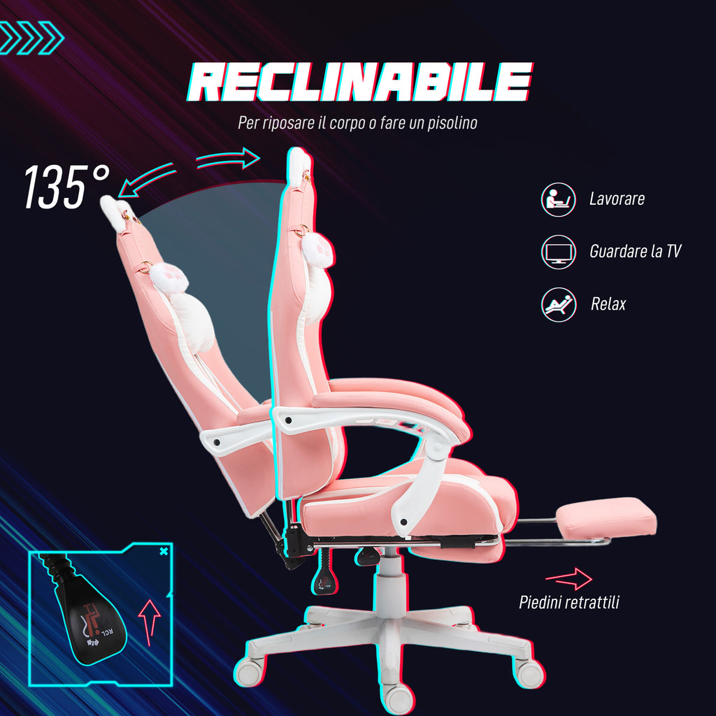 Sedia da Gaming Ergonomica con Orecchie da Gatto Poggiapiedi Retrattile e Schienale Reclinabile 135° Rosa
