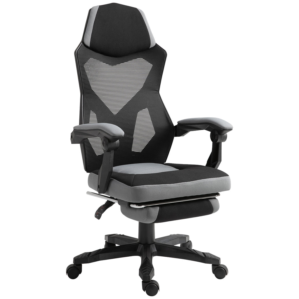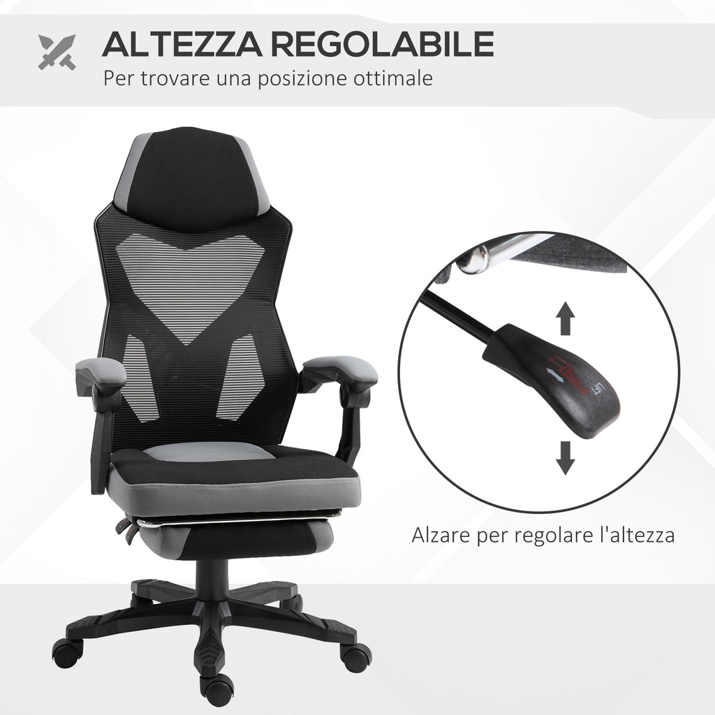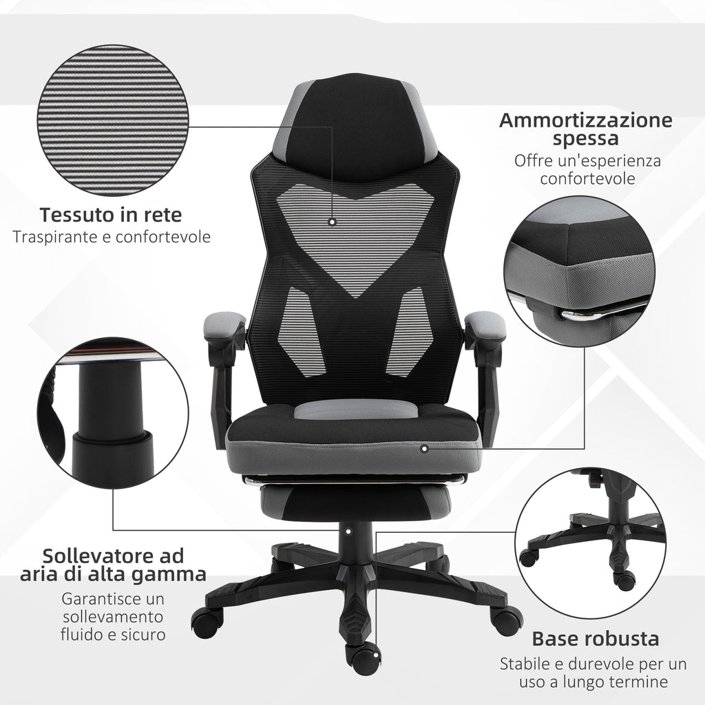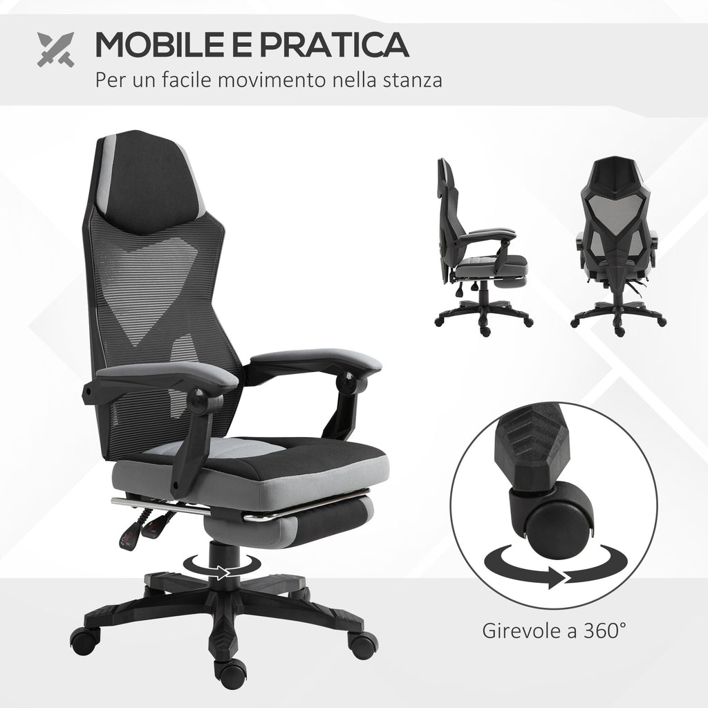 Sedia da Gaming Ergonomica con Schienale Reclinabile e Poggiapiedi Retrattile in Tessuto Grigio