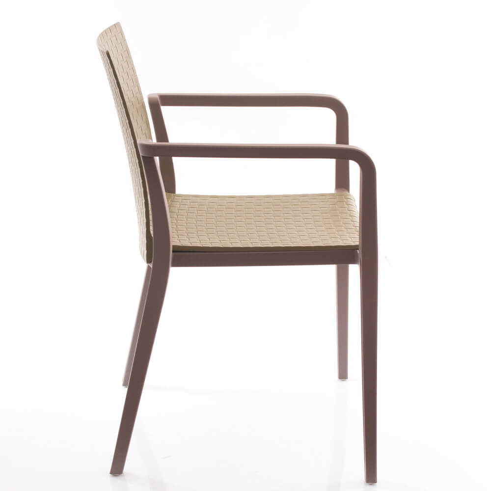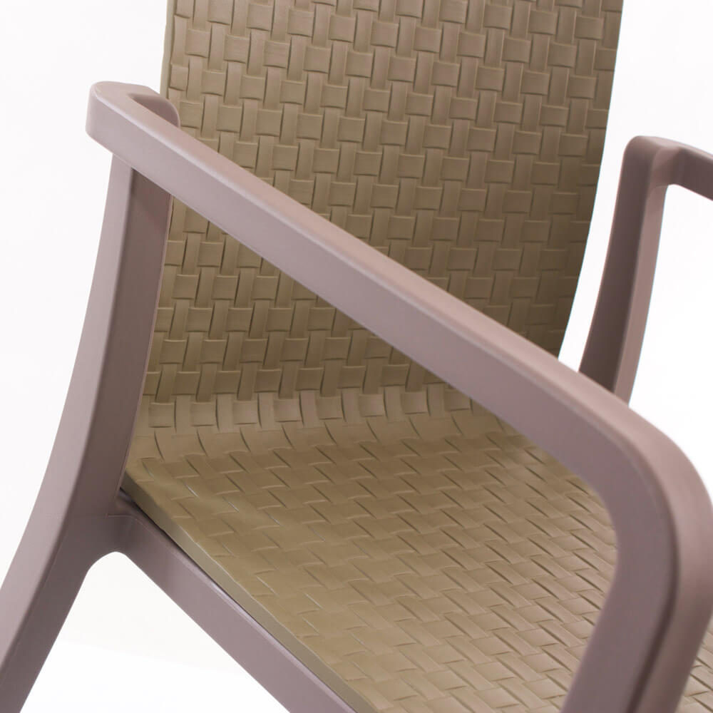 Sedia in resina verde con i braccioli. Adatta per uso interno ed esterno. Impilabili.