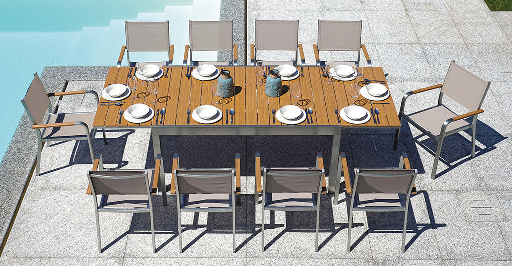 - Material: Struktur aus satiniertem Aluminium mit Armlehnen aus Harzholz in der Farbe Teak