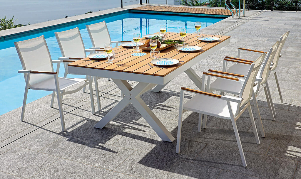 - Material: Struktur aus weißem Aluminium mit Armlehnen aus Harzholz in der Farbe Teak