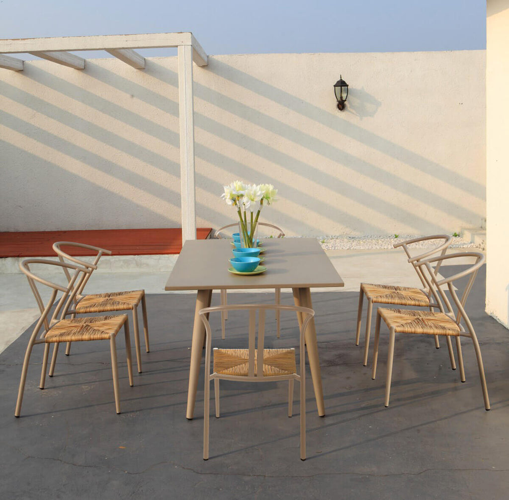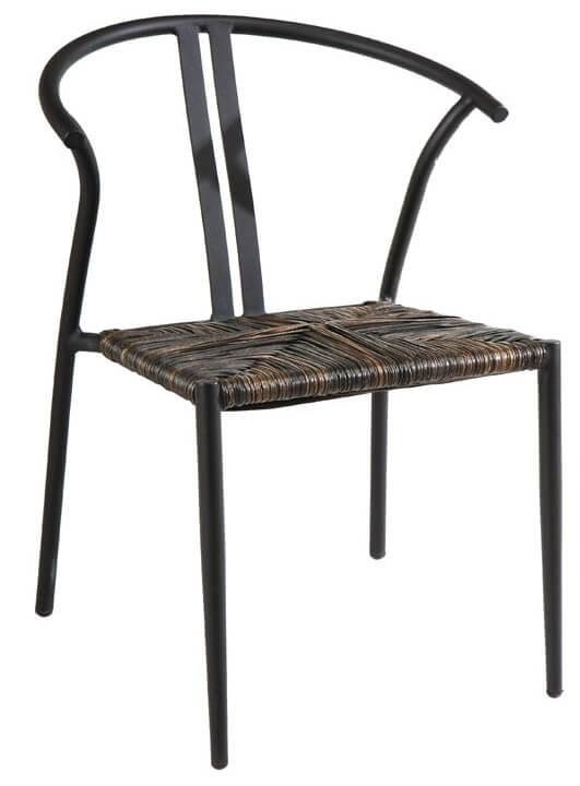 Gartenstuhl aus Aluminium mit Sitzfläche aus dunklem Kunststroh. Stapelbar.