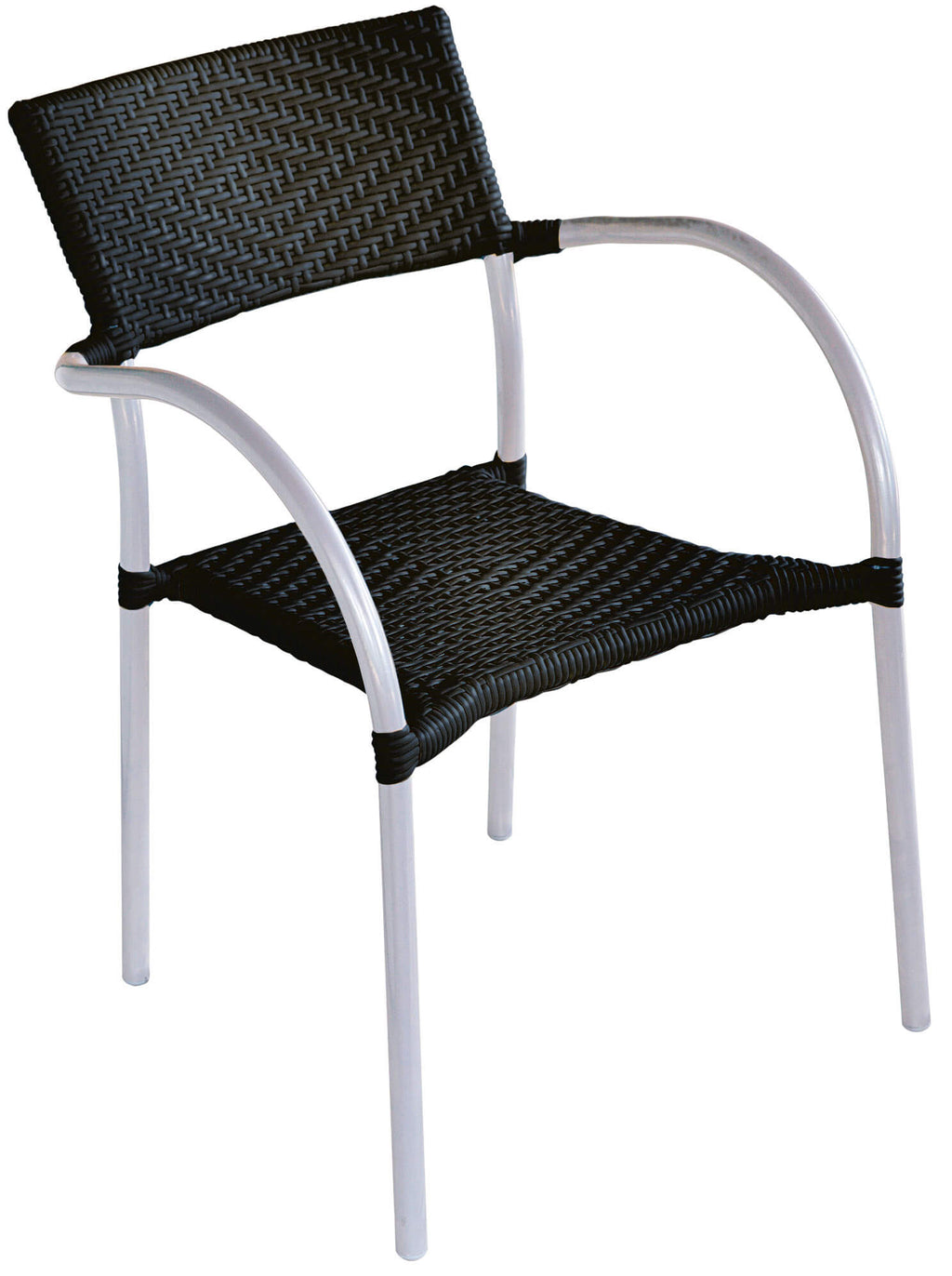 Gartenstuhl aus Aluminium und Korbgeflecht. Stapelbar.