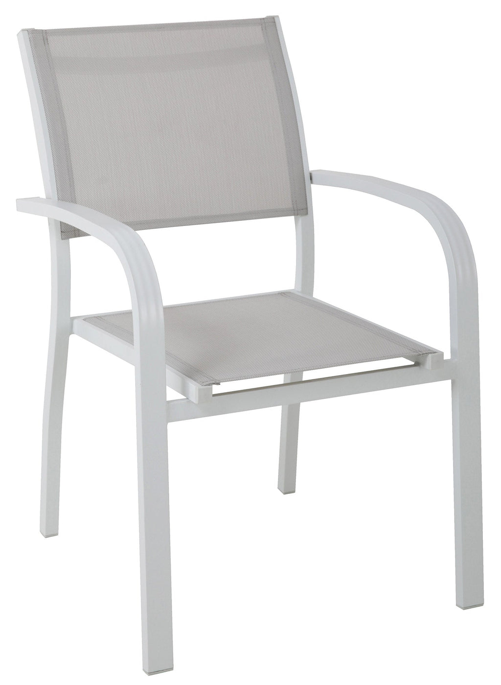 Gartenstuhl aus Aluminium mit weißen Armlehnen. Stapelbar.