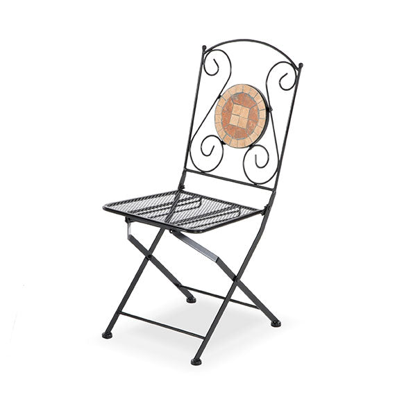 Klappstuhl, Struktur aus schwarz pulverbeschichtetem Eisen, Rückenlehne mit Mosaikeinlage aus KeramikMaße: 42 x 55 x 92 cm